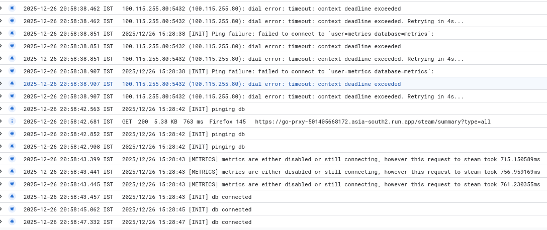 Wouldn’t it be nice if I could track latencies? but surely, a database isnt needed for this, heck I could just fmt.Logf(""), read the logs on Cloud Run console and call it day. But no, I really wanted to get my hands on PostgreSQL and NOT use any managed services for the same.